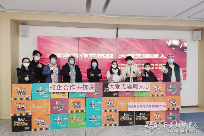 涓滴之水成海洋,物资捐赠暖人心。2022年1月19日,校企合作单位西安易光年电子商务有限公司向亚欧语言文化学院德语系学生捐赠了40箱方便面,以助力学生抗疫。亚欧语言文化学院党委书记、副院长卫军茹,综合办副主任尹娜代表学院接收爱心物资。